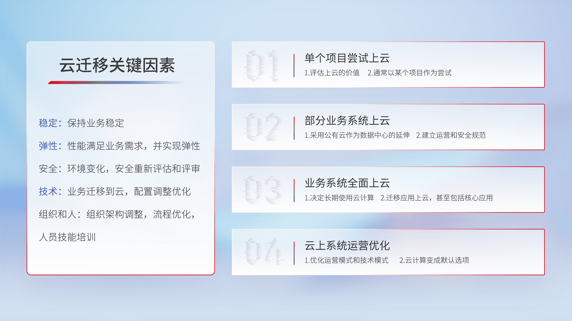 结合实际业务,,,从规划设计、、云平台选型、、云原生改造、、数据迁移、、集成交付,,,迁移全过程为客户识别最佳上云路径,,,,做好风险识别管理,,设计网络架构、、、、身份权限、、、、安全审计合规、、操作审计、、日志审计、、、监控告警策略、、多站点容灾设计等,,,对云上基础设施进行整体规划,,提升IT治理水平,,,以满足弹性、、、、高可用、、、高性能的需求。。。。
